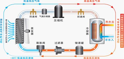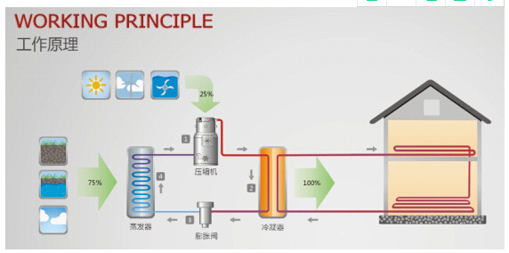 空氣源熱泵通過極少的電能吸收空氣中大量的低溫熱能,經過壓縮機的壓縮變?yōu)楦邷責崮?,傳遞水中將水加熱,熱水通過地暖管用于供暖。