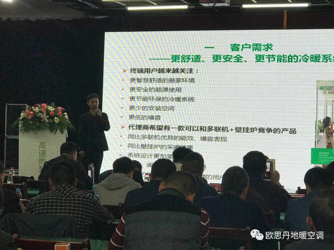 從舒適性、******性和節能性來看,“夏天制冷,冬天供暖”的空氣源熱泵冷暖系統是越來越多人的選擇。在會上,大區銷售總監孫澤奇介紹了歐思丹直流變頻低溫風冷熱泵應用地暖空調二聯供系統。歐思丹熱泵機組壓縮機采用“直流變頻+EVI噴氣增焓技術”,實現超低溫-30℃穩定運行,-20℃制熱穩定不衰減,能效高,采用“W-A-R變流量自平衡專利技術”、“******化霜及防二次長冰技術”等技術,化霜速度極快。除此之外,經過多次技術創新和改良,歐思丹空氣源熱泵已解決換熱效率低、化霜速度慢、升溫速度慢、噪音大四大痛點,瞬間成為全場的亮點。